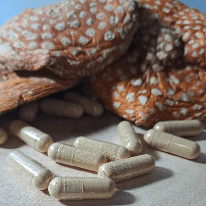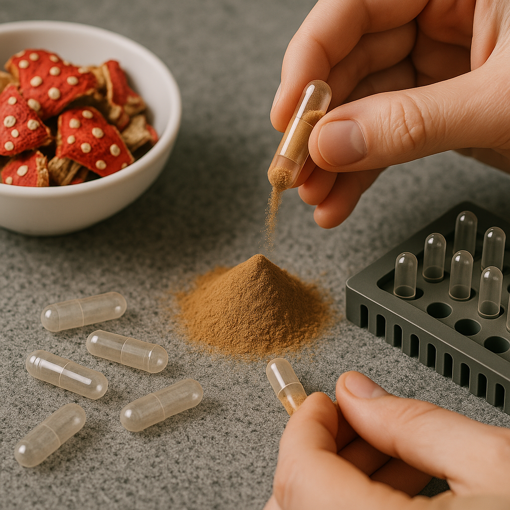 Після сушіння гриби подрібнюються до дрібного порошку, що дозволяє забезпечити однорідність та точність дозування кожної капсули.